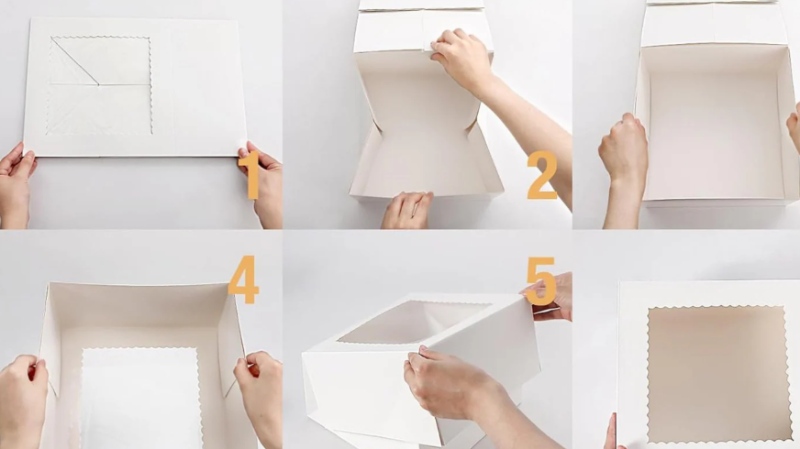 Nắp hộp có thể làm liền với thân hoặc nắp rời tùy nhu cầu sử dụng. Nắp rời thường tiện cho việc mở đóng và vận chuyển bánh. Để tăng tính thẩm mỹ, bạn có thể khoét một ô vuông hoặc tròn trên nắp và dán mica trong làm cửa sổ, giúp nhìn rõ bánh bên trong mà vẫn bảo vệ bánh khỏi bụi bẩn. Hoàn thiện bước này, bạn đã có một chiếc hộp giấy đơn giản, phù hợp cho cách làm hộp đựng bánh kem tại nhà, vừa tiết kiệm vừa linh hoạt.
